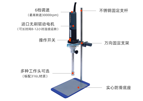 高剪切分散乳化機(jī)集靈巧、方便于一身??墒殖植僮?。選用德國(guó)原裝無(wú)刷大功率馬達(dá),無(wú)刷電機(jī),運(yùn)行更穩(wěn)定,噪聲更小,可處理更大范圍粘度物料。轉(zhuǎn)速可達(dá)30000rpm,可長(zhǎng)時(shí)間8-12小時(shí)連續(xù)運(yùn)轉(zhuǎn),多種工作頭可供選擇,輕松滿(mǎn)足多種高要求分散、乳化、均質(zhì)的實(shí)驗(yàn)要求 。