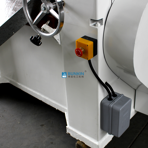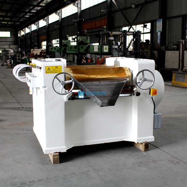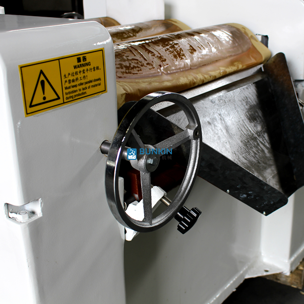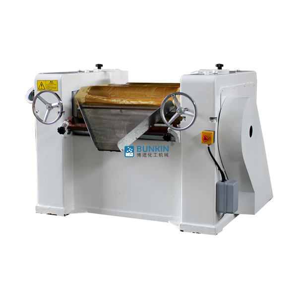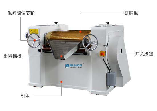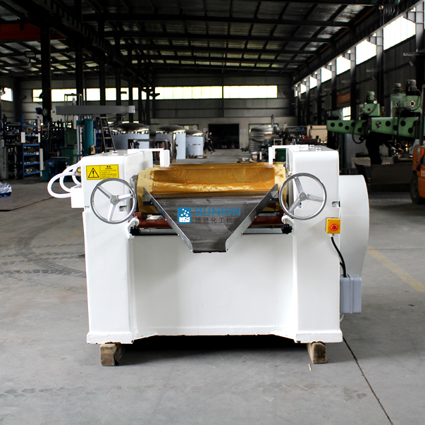 三輥研磨機(jī)由三個輥筒組成,裝在一個機(jī)架上,由電動機(jī)直接帶動。一般輥筒間的轉(zhuǎn)動方向不同,前輥向前轉(zhuǎn)動,中輥向后轉(zhuǎn)動。輥?zhàn)愚D(zhuǎn)速前輥快、后輥慢。中間輥固定,前后兩輥裝在滑道上,有彈簧裝置,用手輪調(diào)節(jié)前后輥與中輥的距離。物料由后輥與中輥之間進(jìn)入,受到輥筒的擠壓,產(chǎn)品顆粒變細(xì),然后由快輥帶出,快輥末端裝有刮刀,使物料與輥筒分離,落入收集桶內(nèi)。