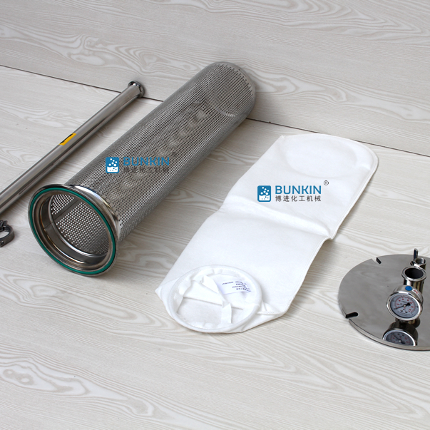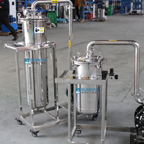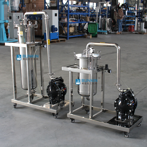 移動(dòng)式袋式過濾器包括了一個(gè)不銹鋼袋式過濾器、氣動(dòng)隔膜泵、氣源二聯(lián)件、單氣控閥,裝置在手推車上,可隨意移動(dòng)至任何生產(chǎn)線上進(jìn)行工作。袋式過濾系統(tǒng)是一種新型的過濾系統(tǒng),過濾機(jī)內(nèi)部由金屬網(wǎng)籃支撐濾袋,流體由入口流進(jìn),經(jīng)濾袋過濾后從出口流出,雜質(zhì)被攔截在濾袋中,更換濾袋后繼續(xù)使用。主要用于過濾產(chǎn)品的雜質(zhì),帶壓力監(jiān)測表,當(dāng)壓力過大提醒更換濾袋。