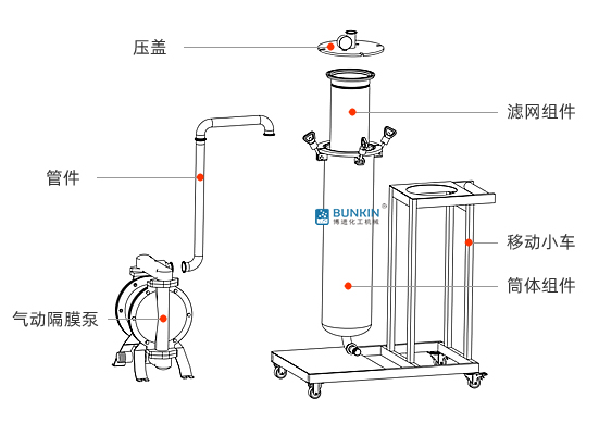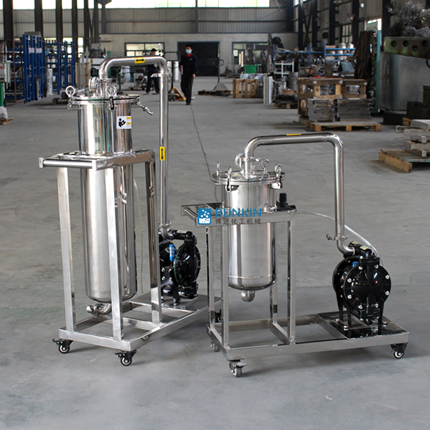 過濾小車包括了一個(gè)不銹鋼袋式過濾器、氣動(dòng)隔膜泵、氣源二聯(lián)件、單氣控閥,裝置在不銹鋼手推車上。氣動(dòng)隔膜泵將物料從拉缸或者罐體吸入至過濾器外殼的旁側(cè)入口管流入濾袋,過濾掉雜質(zhì)后的物料泵送至灌裝機(jī)進(jìn)行灌裝或者進(jìn)入儲(chǔ)罐儲(chǔ)存。袋式過濾器是一種壓力式過濾裝置,主要有過濾筒體、過濾筒蓋和快開機(jī)構(gòu)、不銹鋼濾袋加強(qiáng)網(wǎng)等主要部件組成,濾液由過濾機(jī)外殼的旁側(cè)入口管流入濾袋,濾袋本身是裝置在加強(qiáng)網(wǎng)籃內(nèi),液體滲透過所需要細(xì)度等級(jí)的濾袋即能獲得合格的濾液,雜質(zhì)顆粒被濾袋攔截。不銹鋼移動(dòng)小車,帶萬向腳輪,移動(dòng)方便。無電火花產(chǎn)生,符合防爆要求。