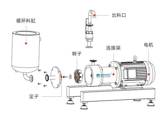 實(shí)驗(yàn)室乳化泵采用臥式結(jié)構(gòu);在狹長(zhǎng)的工作腔內(nèi)裝有一組或多組轉(zhuǎn)定子,轉(zhuǎn)定子對(duì)耦精密配合;由電機(jī)帶動(dòng)中間軸進(jìn)行高速運(yùn)轉(zhuǎn),轉(zhuǎn)定子形成真空,物料從雙層料桶進(jìn)口被吸入轉(zhuǎn)定子腔內(nèi),強(qiáng)大動(dòng)能使轉(zhuǎn)子產(chǎn)生極高的線速度,使物料在轉(zhuǎn)、定子間隙之間經(jīng)過(guò)強(qiáng)烈的撞擊、破 碎、離心擠、液層摩擦、強(qiáng)力剪切之后泵送出去,物料從出口流出并進(jìn)入單/雙層料桶循環(huán),從而使不相溶的固相、液相、氣相等多種介質(zhì)在瞬間均勻精細(xì)、分散乳化,使產(chǎn)品達(dá)到穩(wěn)定的高品質(zhì)產(chǎn)品。