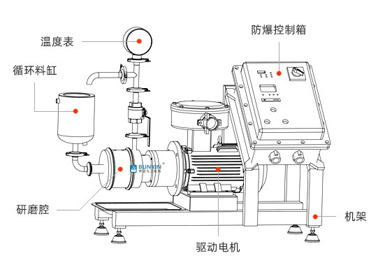 所配料桶及研磨腔體帶冷卻水夾套,在設(shè)備運(yùn)行時通水冷卻,起到很好的冷卻效果,常規(guī)溫升小于10º。