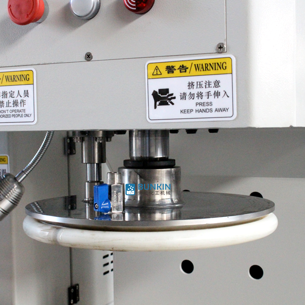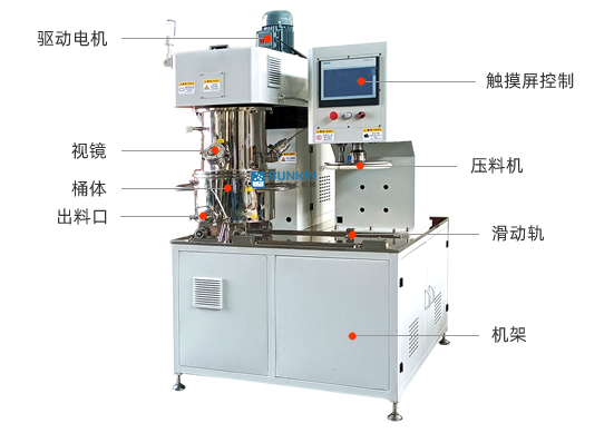 行星架轉(zhuǎn)動(dòng)時(shí),帶動(dòng)箱內(nèi)的兩個(gè)攪拌框及分散軸圍繞反應(yīng)釜軸線公轉(zhuǎn)的同時(shí)高速自轉(zhuǎn),從而使物料受到強(qiáng)烈的剪切、捍合作用,達(dá)到充分分散和混合的目的;在行星架上有一刮壁刀隨行星架轉(zhuǎn)動(dòng),緊貼桶壁不斷的刮拭,使桶壁無滯留料,提高混合效果。攪拌時(shí)間的長短根據(jù)物料的屬性的不同由用戶掌握,可通過控制面板調(diào)節(jié)。封蓋及行星攪拌器由液壓升降,操作平穩(wěn)、快捷、輕便。