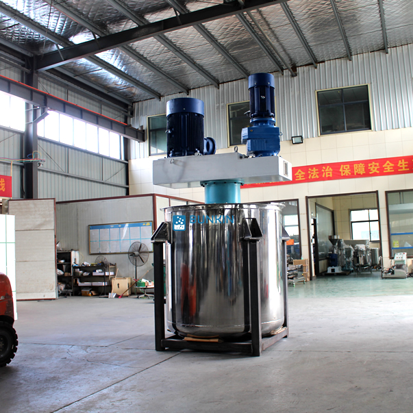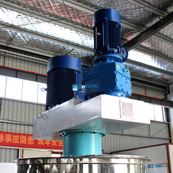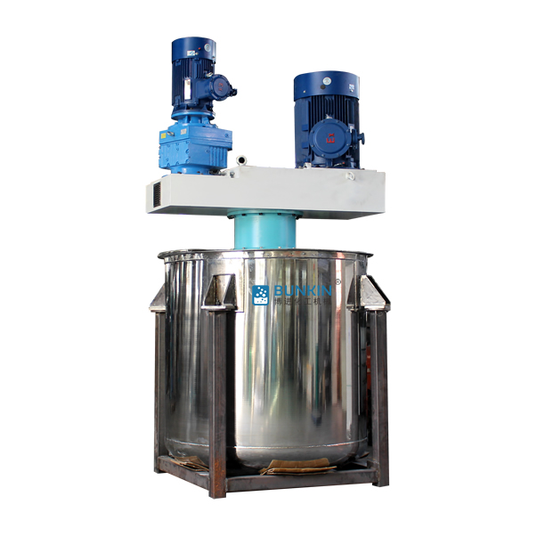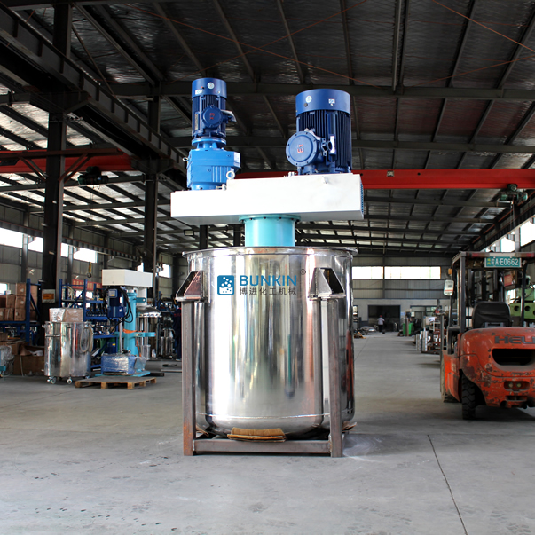 同心雙軸分散攪拌釜攪拌漿葉在動力機組的驅(qū)動下,沿固定方向旋轉(zhuǎn);在旋轉(zhuǎn)過程中,驅(qū)使物料做軸向旋轉(zhuǎn)和徑向旋轉(zhuǎn)。攪拌機內(nèi)的物料,同時存在軸向運動和圓周運動,因而同時存在剪切攪拌和擴散攪拌等幾種攪拌形式。在攪拌槳上裝有刮刀,緊貼桶壁刮拭,刮刀隨著攪拌器旋轉(zhuǎn)時把桶壁的物料完全刮掉,使桶壁無滯留料,同時提高混合效果。分散盤通過高速運轉(zhuǎn),使物料呈環(huán)狀流,產(chǎn)生強旋渦,呈螺旋狀下降到渦流底部。粒子間產(chǎn)生強烈的剪切撞擊與磨擦,達到迅速分散、溶解功能。攪拌盤通過圓周運動,產(chǎn)生較好的徑向作用里,加速物料循環(huán),提高分散效率。
